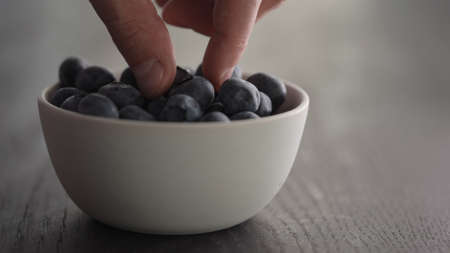 Man hand pick ripe blueberries from white bowl on oak table