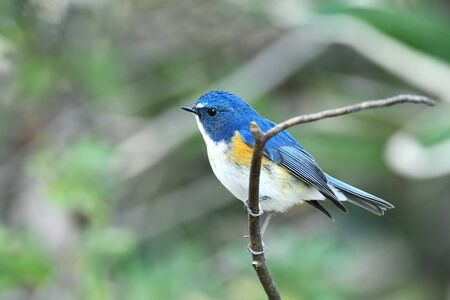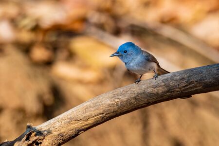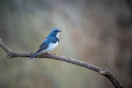 A beautiful Ultramarine Flycatcher, Ficedula superciliaris, sitting on a tree branch with blurry background