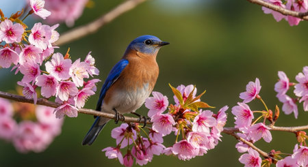 Vibrant bird perched on cherry blossom branch in spring