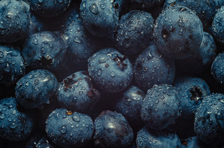 Blueberries covered by water drops. Macro photography of fresh blueberries. Ripe blueberries background. Blueberries texture. Food photography collection.