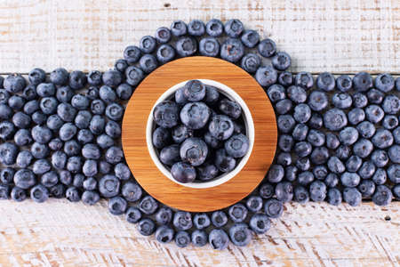 Fresh blueberry on white rugged wooden table - delicious label design with circular servig board in center