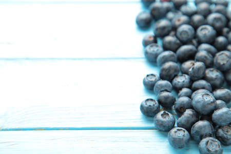 Ripe blueberries on wooden table close up