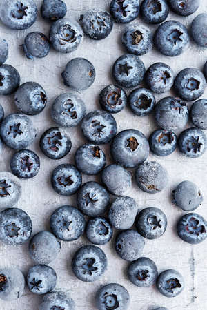 Frozen blueberries on metal surface. Top View