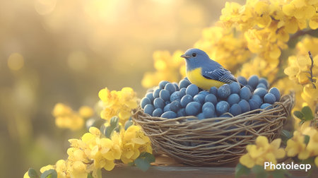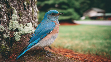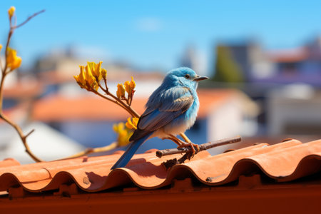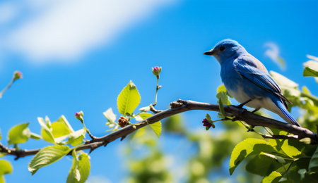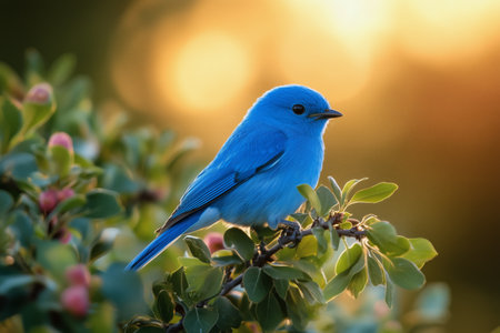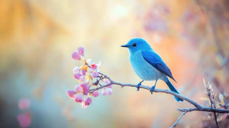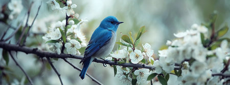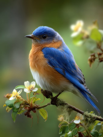 Bluebird sits on a branch with flowers, a symbol of happiness and hope in folklore, showing vibrant colors and natural beauty in a garden.
