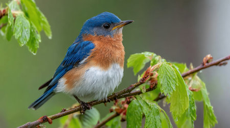 A bluebird sits on a branch surrounded by new green leaves. It is springtime, and the bird appears content and still.