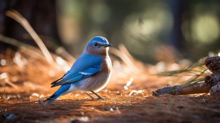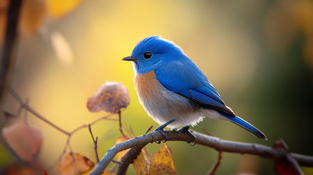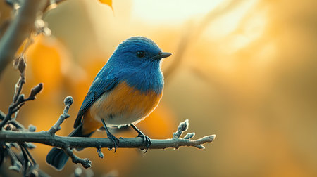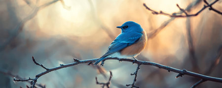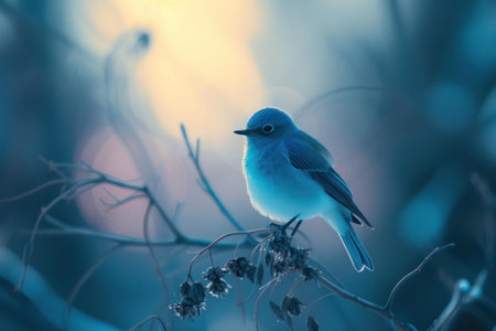 Tranquil bluebird perching on delicate branches at twilight, surrounded by serene natural light and bokeh, in a peaceful wildlife habitat at dusk