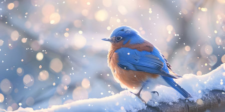 Blue Bird Sitting on a Snowy Tree background, Winter Season - Ai Generated