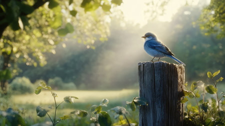 A tranquil morning scene featuring a blue bird perched on a rustic wooden post. Soft sunlight filters through lush greenery, highlighting the beauty of nature.