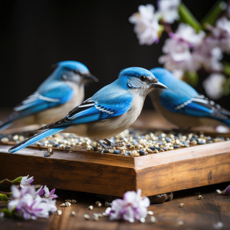 Blue jays gathered at a platform bird feeder filled with sunflower seeds