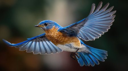 A striking bluebird with outstretched wings is captured mid-flight, showcasing a palette of blue, brown, and orange hues. The image features a shallow depth of field, blurring the background. This photograph could be used for various commercial or editorial purposes highlighting nature and wildlife.