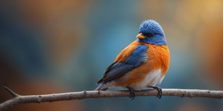 A colorful bird with blue and orange plumage stands confidently on a glass object. The soft, diffused light creates a serene atmosphere, highlighting its features distinctly.