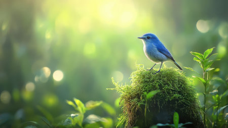 A blue bird is perched on a mossy rock in a lush green forest. The bird is small and he is looking up at something in the distance. The scene is peaceful and serene