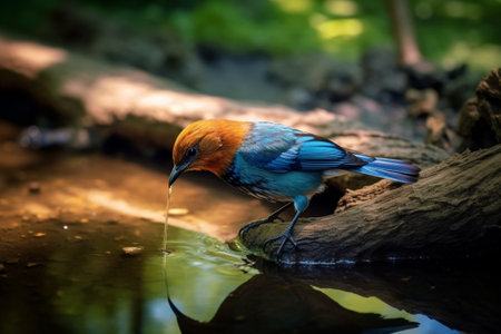 A colorful bird with blue and orange plumage is showcased perched on a branch. The composition features a natural environment with lush green moss and foliage. The image employs soft lighting, possibly outdoors, and could be utilized for nature-themed projects, educational content, or artistic illustrations.