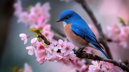 A beautiful blue bird perched on a branch with pink flowers. The bird's blue feathers and the soft pink flowers create a vibrant and delicate contrast.