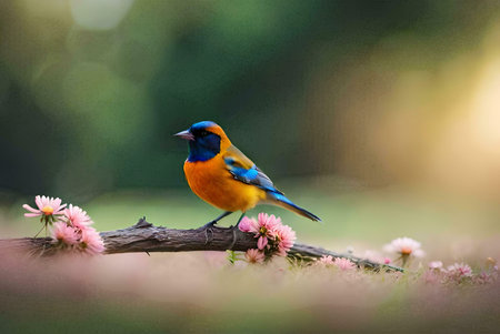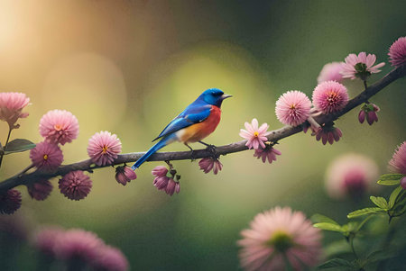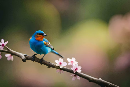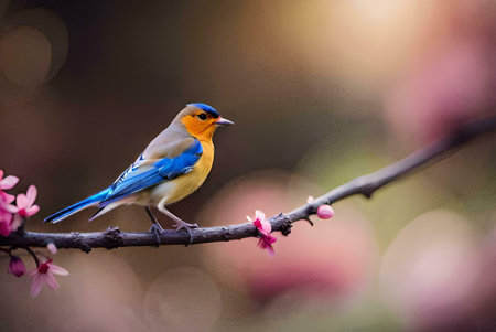 A blue and orange bird is perched on a branch of a pink tree. The bird is surrounded by pink blossoms, creating a serene and peaceful atmosphere. Concept of tranquility and beauty