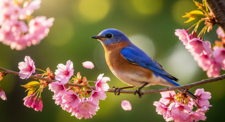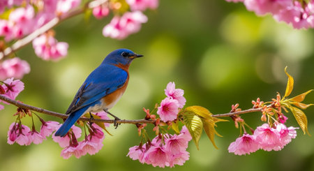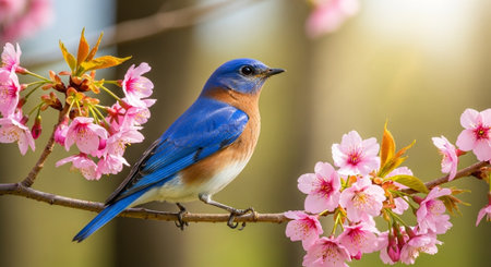 Eastern bluebird perched among pink cherry blossom branches springtime