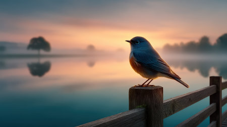 A captivating blue bird sits gracefully on a wooden fence beside a calm lake. The scene is enveloped in early morning mist with soft sunrise colors, evoking tranquility and peace.