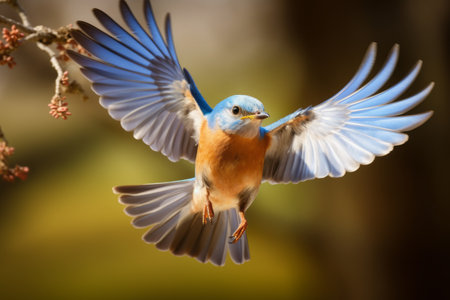 A bluebird is captured mid-flight, showcasing its wings in an open position. The bird presents a vibrant palette of blues, oranges, and white plumage, with textured feathers. The soft-focus background suggests an outdoor setting, possibly during daylight. This image could be suitable for various commercial and editorial applications.