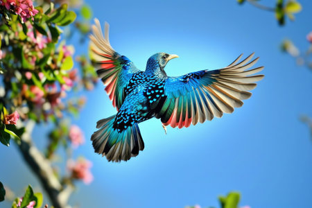 A vibrant bird in mid-flight surrounded by lovely spring blossoms, capturing the essence of nature in a serene outdoor environment. Perfect for nature lovers.