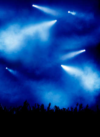 Stage lights and crowd of audience with hands raised at a music festival. Fans enjoying the party vibes.