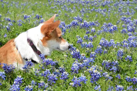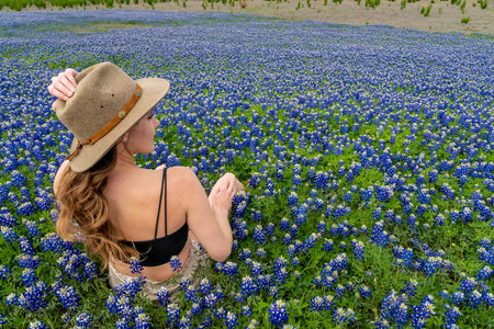 A beautiful brunette model enjoys a field of Bluebonnet flowers on a spring day