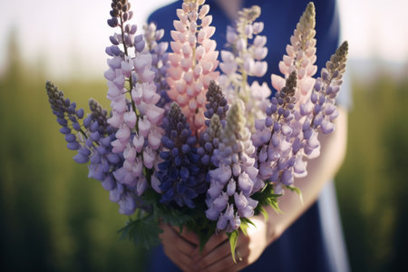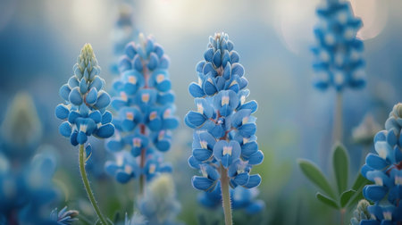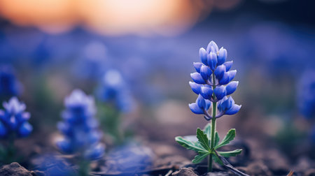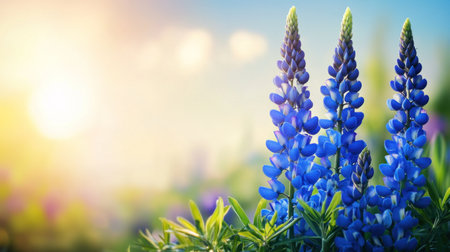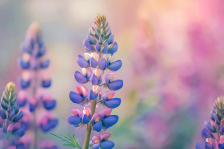 Close up of vibrant lupine flowers growing in a field, showcasing their beauty with a soft, dreamy bokeh effect in the background