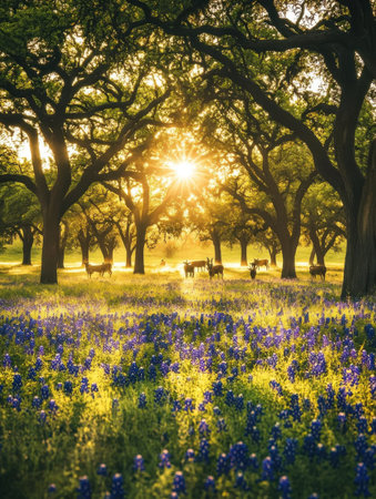 Golden Sunrise Texas Bluebonnet Field Deer Peaceful Nature Scene Tranquil Landscape Majestic Oaks