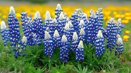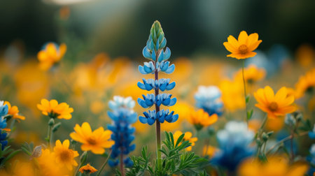 Blue Lupines Amongst Yellow Daisy Wildflowers. summer meadow
