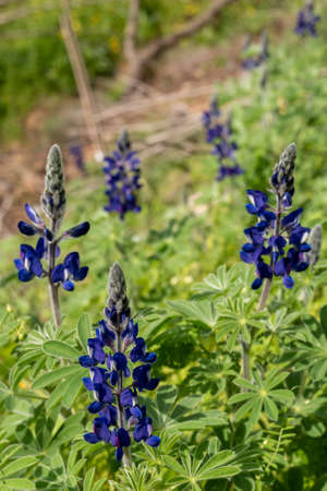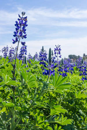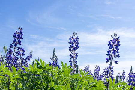 Fresh blossoming lupines in field. High lush purple lupine flowers, summer meadow.
