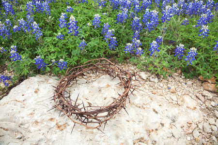A crown of thorns sits on rock beside a patch of Texas bluebonnets