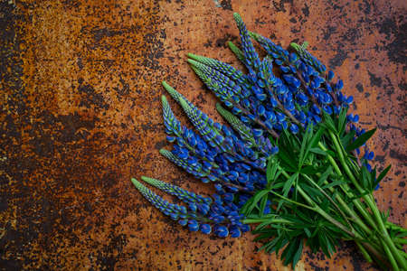 Blue lupine flowers on the meadow at sunset. Beautiful nature background.