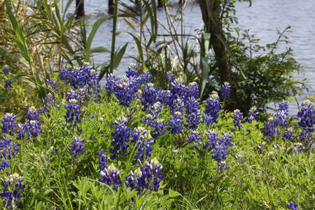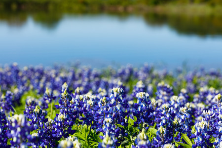 Close up view of beautiful bluebonnets along a lake in the Texas Hill Country.