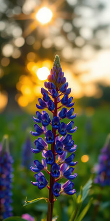 Vibrant purple lupine flowers blooming at sunset in a tranquil field