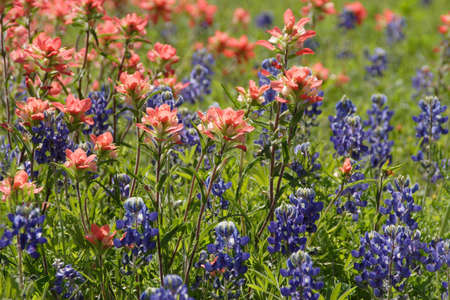 Vivid bluebonnets and Indian paintbrush wildflowers bathed in morning light