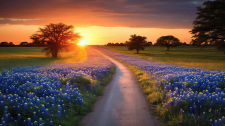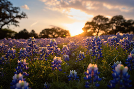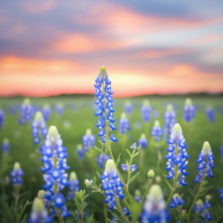 Vibrant bluebonnets bloom at sunset in a serene Texas field during springtime