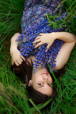 A beautiful gentle brunette woman lies in the grass with a bouquet of blue lupine flowers. view from above.