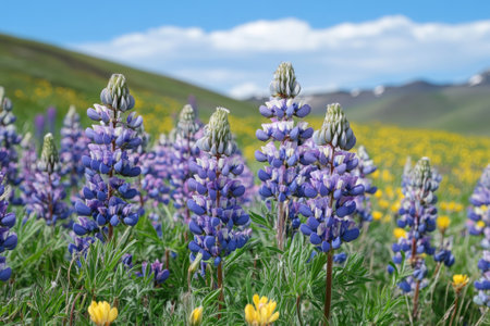 Purple and blue lupine flowers thriving in a vibrant meadow, adding splashes of color to the landscape under a clear blue sky