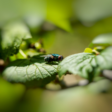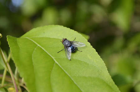 green blowfly sits on a leaf