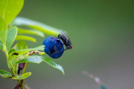 A beautiful close-up of a fly feeding on berries in a garden. A seasonal scenery of rural Latvia, Europe.