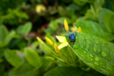 Macro photo of a fly on a green leaf with water drops