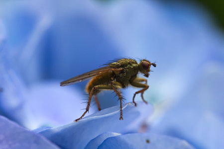 Macro shot of a fly sitting on a blue hortensia flower