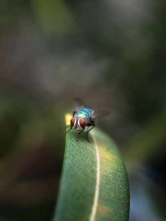 Red eyes, green body the flies on a leaf in the garden.