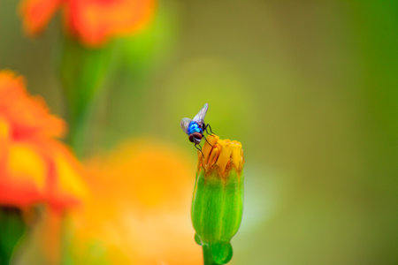 Generative AI Blue fly or Calliphora vomitoria or commonly called the orange-bearded blue bottle fly. Macro photography. Copy space