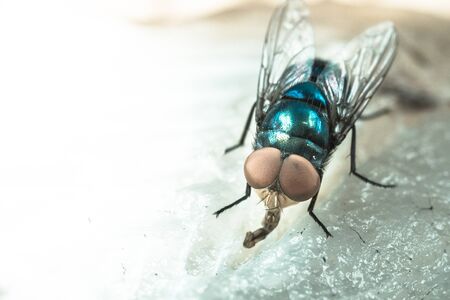 Close up of fly or bluebottle eating dried fish