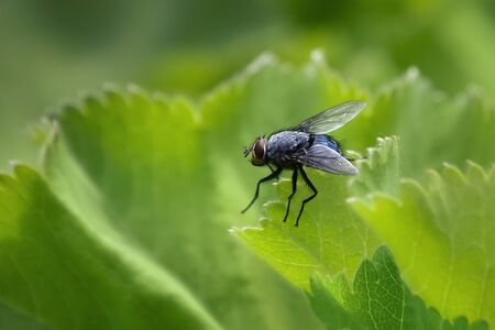 fly sits on green foliage on a green background