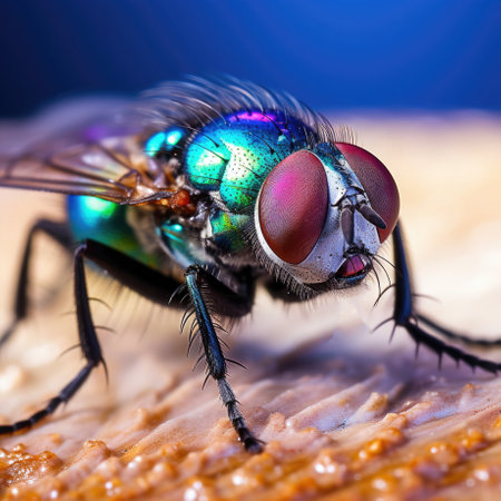 Macro close-up of a fly showing wings, fine hairs and iridescent shimmer on a blurred background. Generative AI.