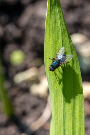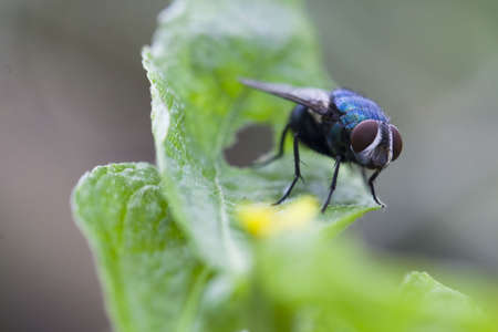 Closeup macro image of bluebottle fly, blow fly (Calliphoridae) on a green leaf in summer
