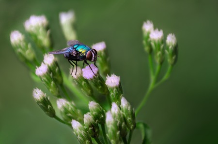 Commom greenbottle fly eating a nectar of aster perennial flower in summer evening
