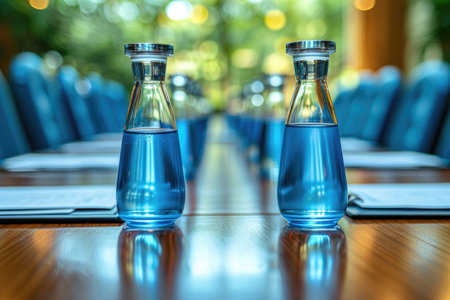 Two Blue Glass Bottles on a Wooden Table with Blurry Background