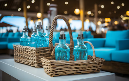 Wicker baskets with bottles of alcohol on the table in a restaurant